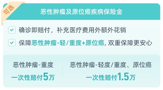 一旦確診惡性腫瘤-重度,一次性直接賠付5萬元;確診惡性腫瘤-輕度或原位癌,也可以一次性賠付1.5萬元。